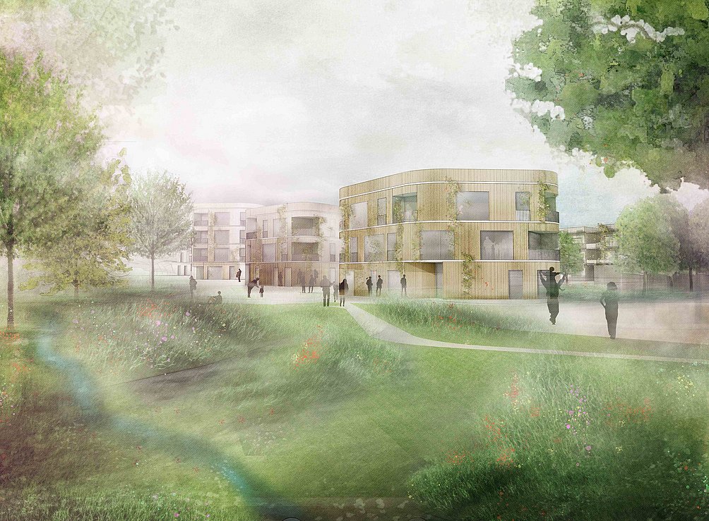 Der Schwerpunkt des Entwurfes von phase 10 liegt auf der Schaffung einer grünen Gartenstadt mit großzügigen öffentlichen Freiräumen und einer Integration von natürlichen Elementen. Der städtebauliche Ansatz besteht aus einer Kombination von Riegelbaustrukturen, punktuellen Gebäuden und qualitätsvollen Freiräumen. Durch die organische Gestaltung und die Durchlässigkeit zwischen öffentlichen und privaten Räumen wird eine lebendige und vielfältige Mitte geschaffen. Die Wohnbebauung umfasst auch Reihenhäuser im nördlichen Teil des Quartiers, die durch ihre Ausrichtung und Staffelung eine optimale Nutzung der Freiflächen ermöglichen.